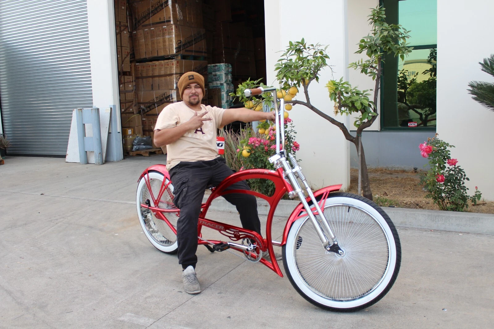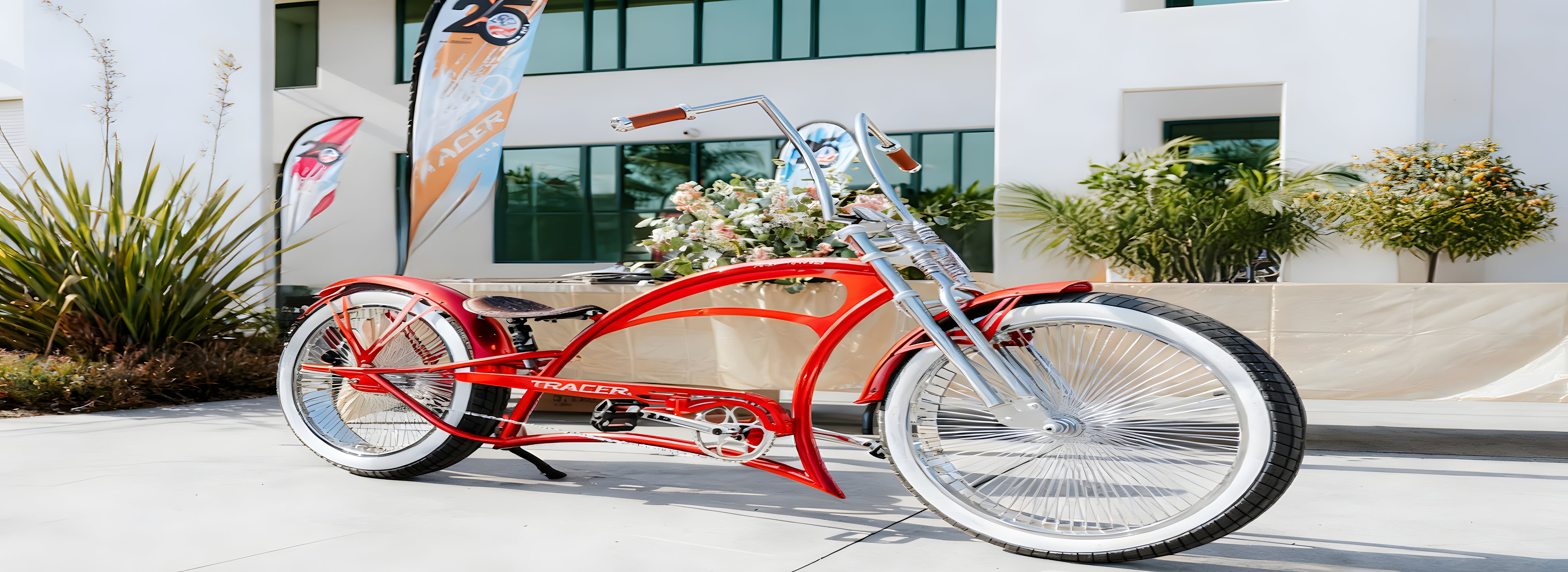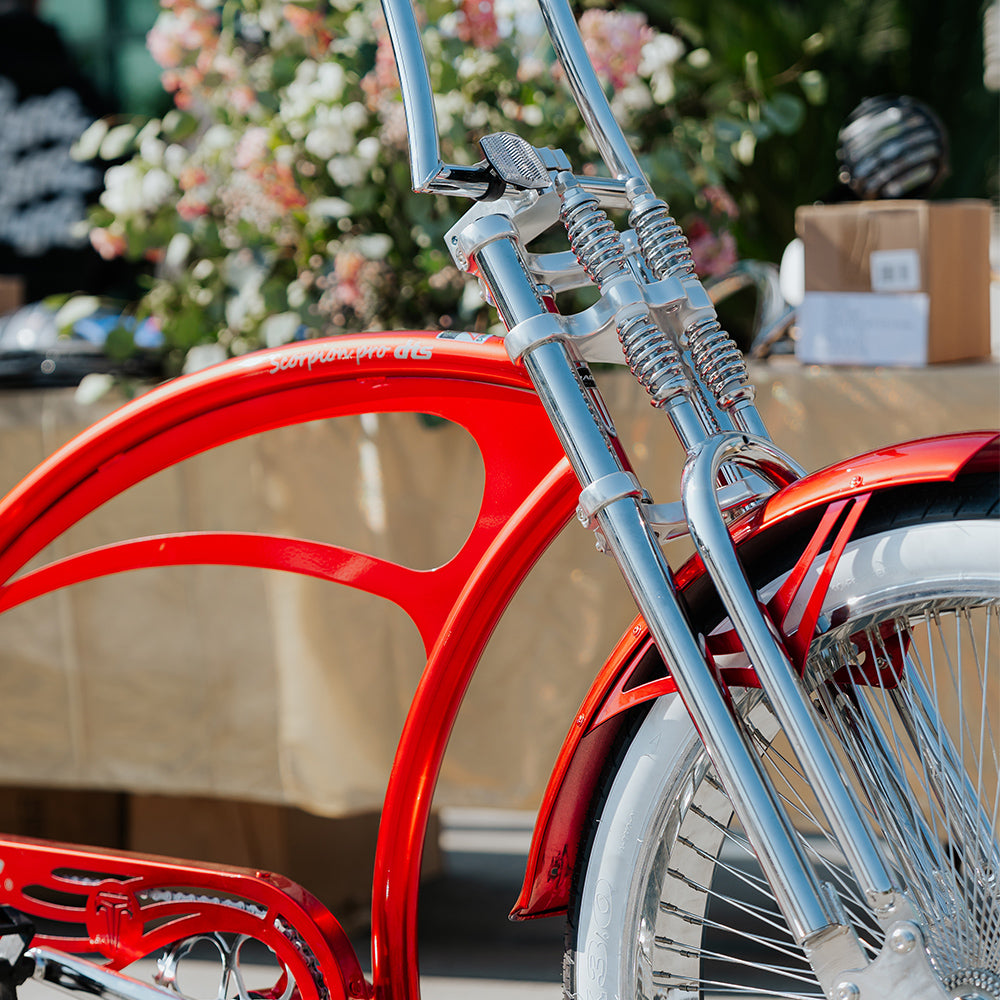 Embrace the ocean breeze with the Tracer Scorpion Pro DTS, where timeless retro style meets seaside adventure. Wide whitewall tires glide effortlessly beside the shoreline, while dual-spring suspension forks absorb every bump, delivering a ride that’s as smooth as it is unforgettable.
