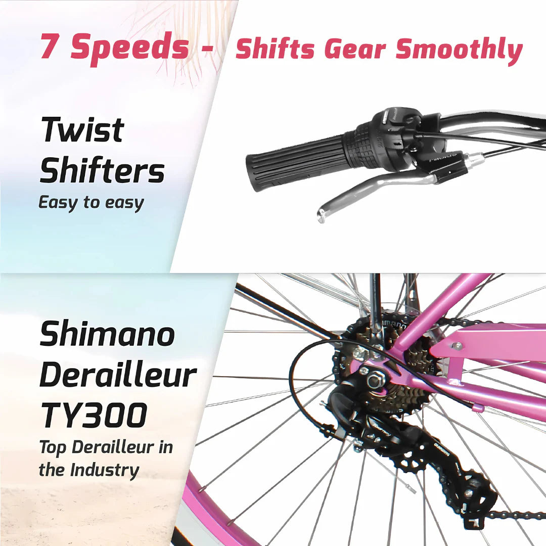 Effortless shifting with Shimano's TY300 Derailleur, combined with smooth twist shifters, makes handling diverse terrains—whether city streets or sandy beaches—a breeze.