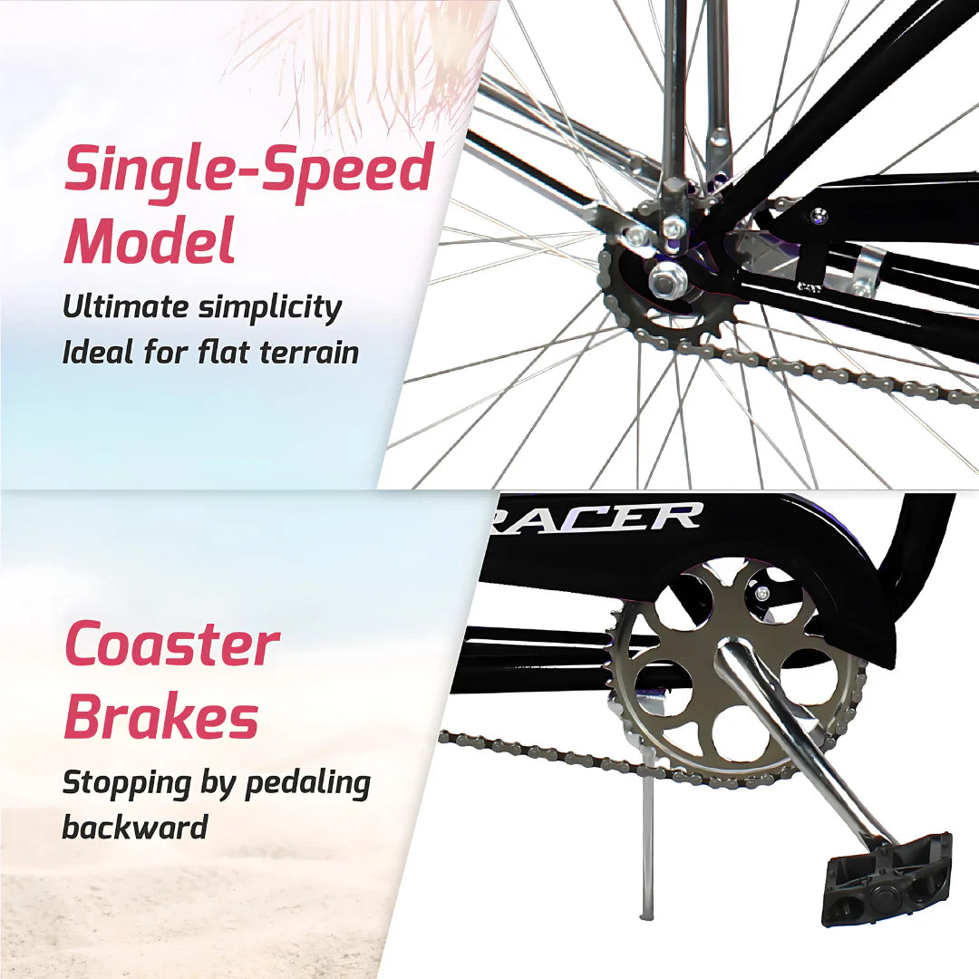 Single-speed simplicity with reliable coaster brakes allows easy backpedal stopping—ideal for those who want a laid-back, stress-free cruising experience.