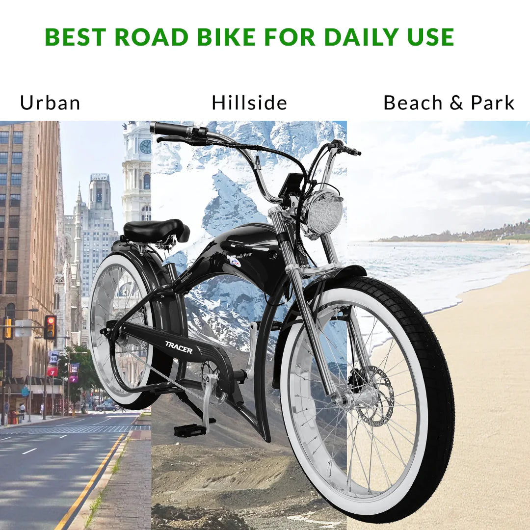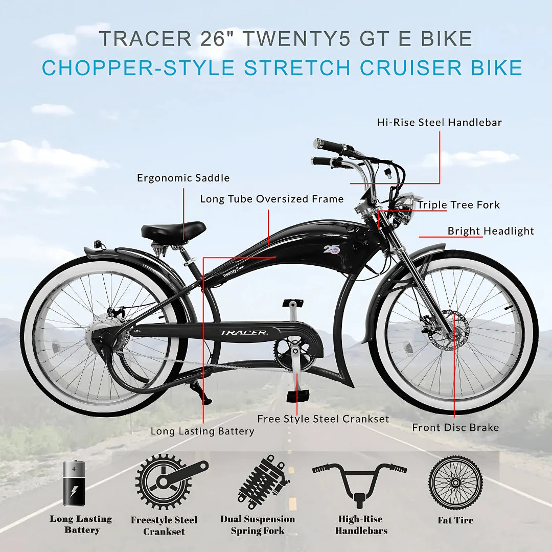 Classic Style, Modern Power The Tracer Twenty5 GT brings the best of both worlds with its vintage chopper style and high-tech e-bike features. Whether you’re commuting or exploring new terrain, this e-bike's unique design, leather spring saddle, and high-rise handlebars make it as comfortable as it is stylish.